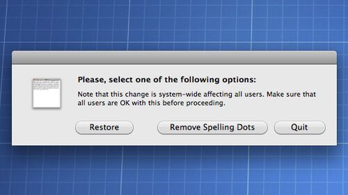 スペルチェックを無効にする「Despeller」。 Welcome to Despeller Despeller を起動させ、「Remove Spelling Dots」をクリックすれば、スペルチェックを無効にすることが出来ます。 また、元に戻したいのであれば、「Restore」をクリックしてください。 こ…